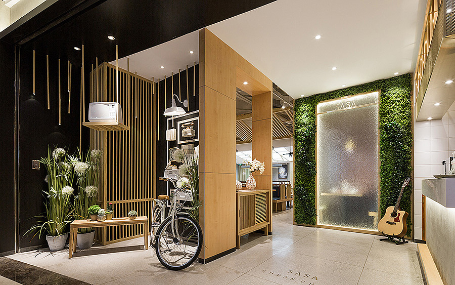 本案中,金博大裝飾,選用白色木色作為空間基調,而原木色則始終貫穿于整個場景,向我們的消費者傳遞出舒適爽朗的感覺,并搭配上暖黃的光線和低飽和度的空間,營造出柔和的感官視覺,我們希望通過這樣不同的就餐體驗來顛覆以往消費者對串串的印象。