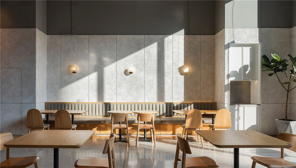 本案咖啡廳是在一個工業(yè)園區(qū)內(nèi),服務于周邊企業(yè)員工和商務洽談。整體咖啡廳裝修設計延續(xù)工業(yè)風框架,以溫潤的木色裝飾空間,營造溫暖、明亮的休閑空間。