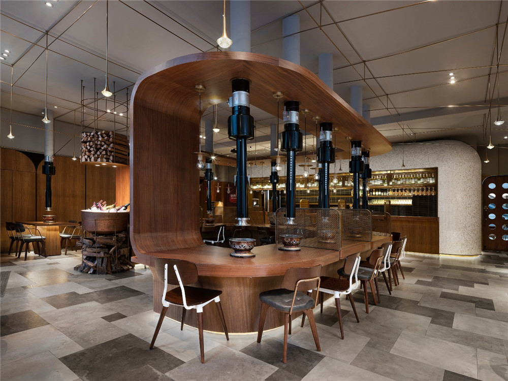 在本案燒烤餐廳裝修設(shè)計中,設(shè)計師在客區(qū)的中心區(qū)域設(shè)計了造型的環(huán)形餐桌,其桌面直通天花形成一個回環(huán),增添了空間的趣味性??拖g可以插入金屬網(wǎng)屏風進行自由的區(qū)域分隔,金屬網(wǎng)屏風能夠有效阻斷烤肉時濺起的食物飛沫,且能隨時取走清洗及消毒,靈活的進行客座區(qū)分隔。