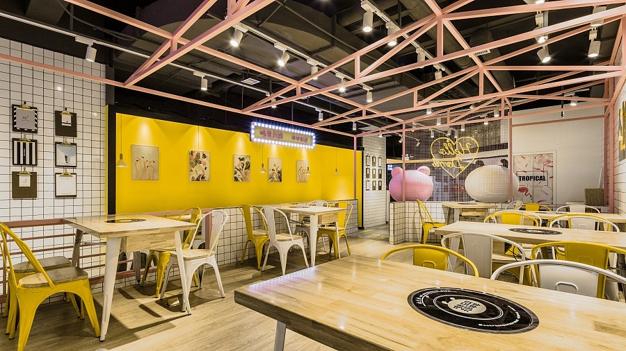 整個(gè)空間以黃色為主色調(diào),搭配上燈光,使得整個(gè)空間顯得既干凈又舒適。把火鍋店卡通形象,設(shè)置在前臺(tái)區(qū)域,不僅有利于宣傳火鍋店,而且有利于吸引感興趣的顧客。