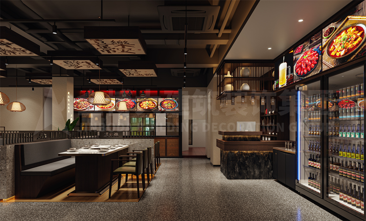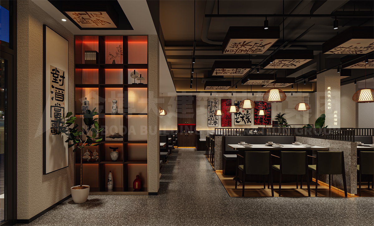 內(nèi)蒙古赤峰戚大俠連鎖餐飲有限公司的新品牌,一個(gè)主打小龍蝦、燒烤、川菜、小酒館的融合餐廳。甲方要求輕裝修重裝飾,在迎合年輕消費(fèi)者的同時(shí)加入國潮元素。金博大餐飲裝修設(shè)計(jì)公司結(jié)合當(dāng)下流行趨勢(shì)與客群定位,最終交出滿意答卷。