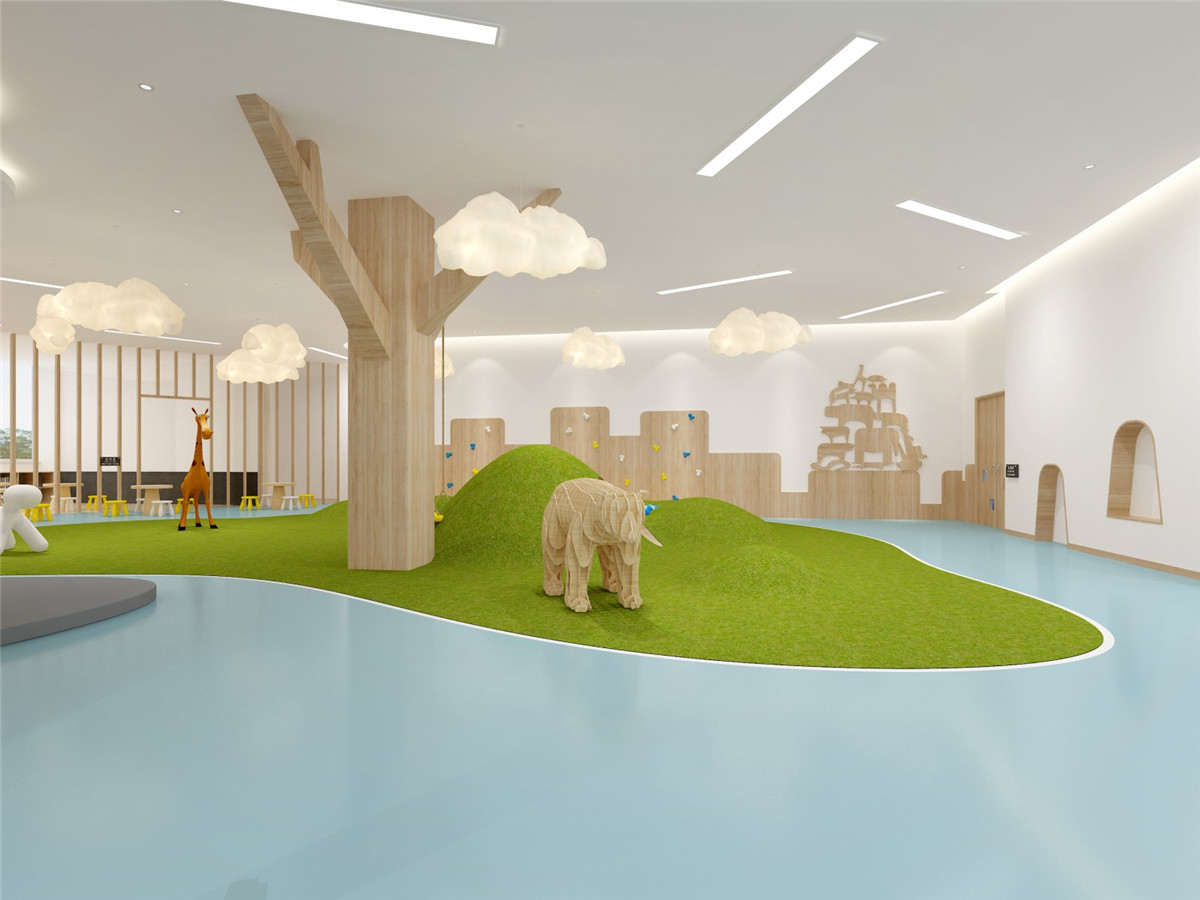 設(shè)計(jì)師從兒童的視角出發(fā),在一層中庭的娛樂區(qū)為孩子們搭建了一個(gè)虛擬森林,夢(mèng)幻般的場(chǎng)景設(shè)計(jì)為整個(gè)幼兒園裝修設(shè)計(jì)增添了童真爛漫的氛圍。每個(gè)教室門的低門洞設(shè)置,可以滿足小朋友們對(duì)于課堂的好奇,激發(fā)他們對(duì)于知識(shí)的向往。