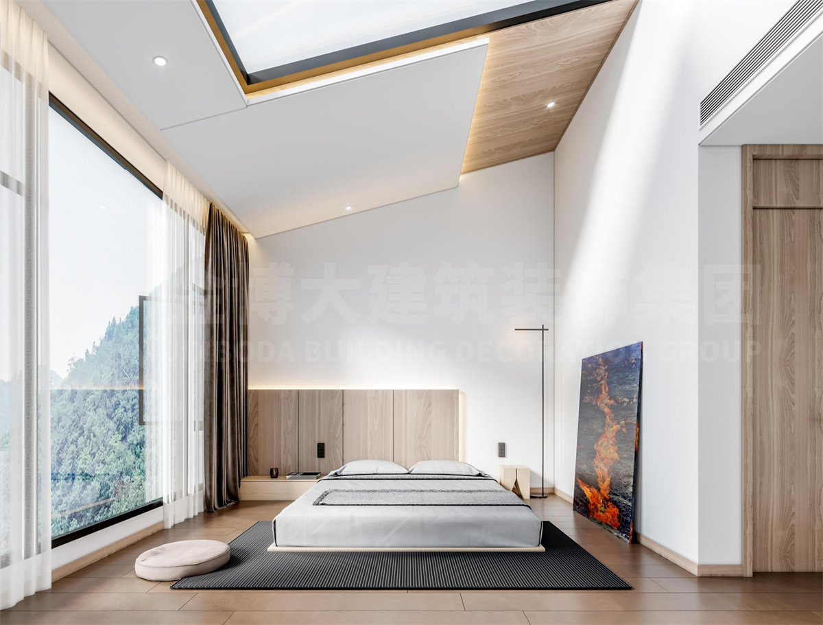 民宿室內(nèi)設(shè)計(jì)以“銀杏”為引,將自然風(fēng)光與室內(nèi)相結(jié)合,運(yùn)用現(xiàn)代極簡(jiǎn)手法結(jié)合質(zhì)樸裝飾,塑造當(dāng)代藝術(shù)住宿體驗(yàn)。不管是接待大廳中的銀杏葉屏風(fēng)還是餐廳中的裝飾畫作,都在闡述空間的主題。餐廳包房規(guī)劃有茶藝區(qū)和用餐區(qū),或品茶觀景,或談笑歡聚,都是愜意之選。