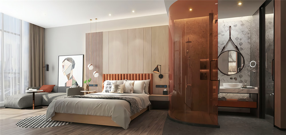 本案悅居精品酒店設(shè)計(jì)案例,金博大裝飾設(shè)計(jì)師以時尚輕奢風(fēng)定義空間。整體酒店裝修設(shè)計(jì)色彩艷麗時尚,造型極具現(xiàn)代時尚美感。酒店客房設(shè)計(jì)延續(xù)現(xiàn)代精致的格調(diào),融入摩登工業(yè)風(fēng)配合色彩調(diào)和,提升顧客入住酒店的舒適度。