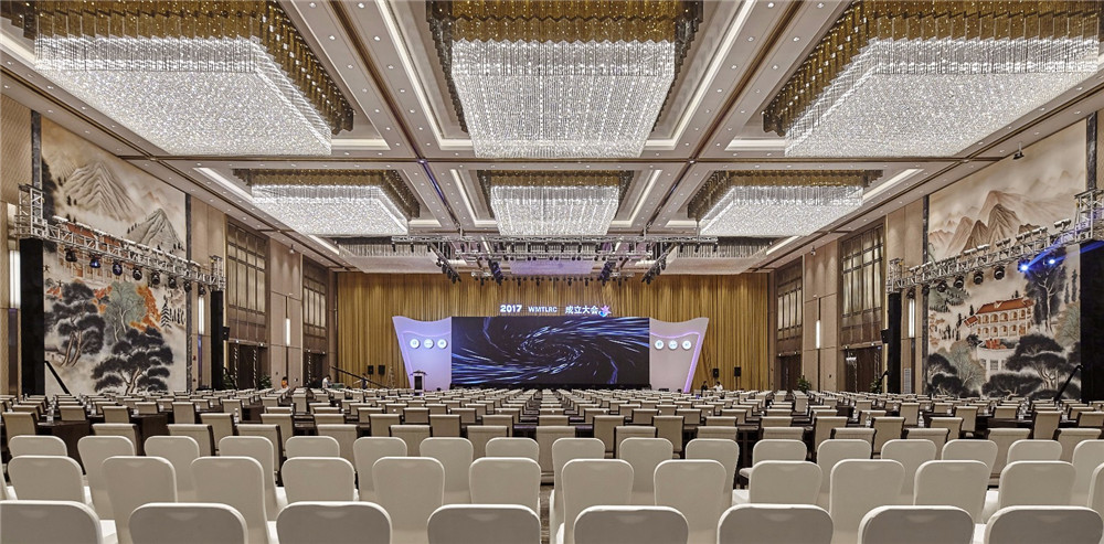 貴州遵義格蘭云天五星級酒店裝修以遵義市花映山紅為酒店主要設計裝飾元素,結(jié)合傳統(tǒng)中式建筑桁架結(jié)構,融入當?shù)靥厣幕?,營造出恢弘大氣的空間氛圍。