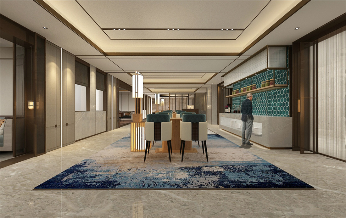 新誠國際酒店裝修設(shè)計從駝人集團文化中提取出沙漠綠洲(希望)、駝人之光(引領(lǐng))、駝鈴精神(旋律)、一帶一路(前行)等元素,打造了一個具有國際化視野、新東方中式風采商務(wù)酒店空間。酒店大堂接待區(qū)背景選取意化的山峰與駱駝,代表了駝人集團砥礪前行的開拓精神。在酒店軟裝設(shè)計中,富有地方特色的豫劇、汴繡、汝瓷等元素都成為空間中的點睛之筆。