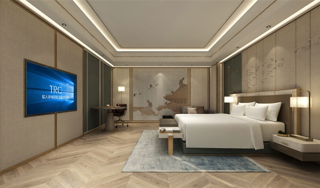 作為駝人集團內(nèi)部接待同時對外經(jīng)營的大型酒店,酒店客房分為三個檔次來適應(yīng)不同需求的消費群體。酒店客房設(shè)計以淺色系為主,打造舒適減壓、賓至如歸的休憩空間。豪華套房設(shè)計將官邸的理念融入空間,現(xiàn)代輕奢風的裝飾中融入中式特色壁畫與汝瓷等元素,營造有品位、有質(zhì)感的特色空間。