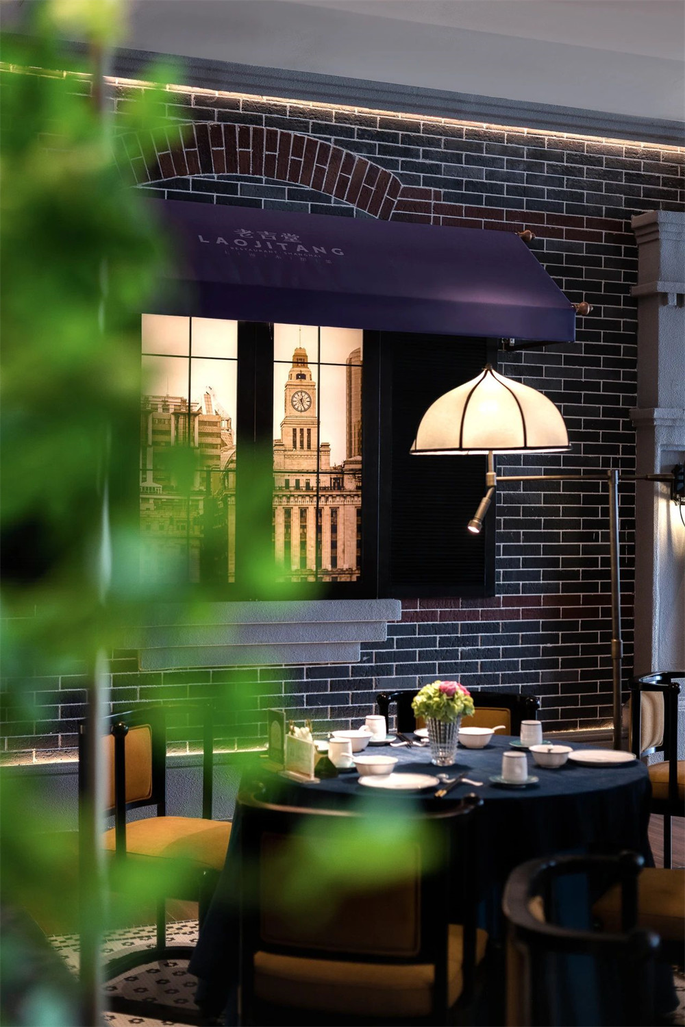 門(mén)店入口頗有老上海的意境,藍(lán)釉色迎賓臺(tái)上一盞中式提燈點(diǎn)綴其中。設(shè)計(jì)師打破常規(guī)將砌磚引入設(shè)計(jì)風(fēng)格于餐廳外立面,如同將老上海的建筑呈現(xiàn)于眼前。透過(guò)窗戶(hù)繁華景象層層遞進(jìn)。靈動(dòng)的大門(mén)待食客們叩響,體驗(yàn)老上海灘的味道。