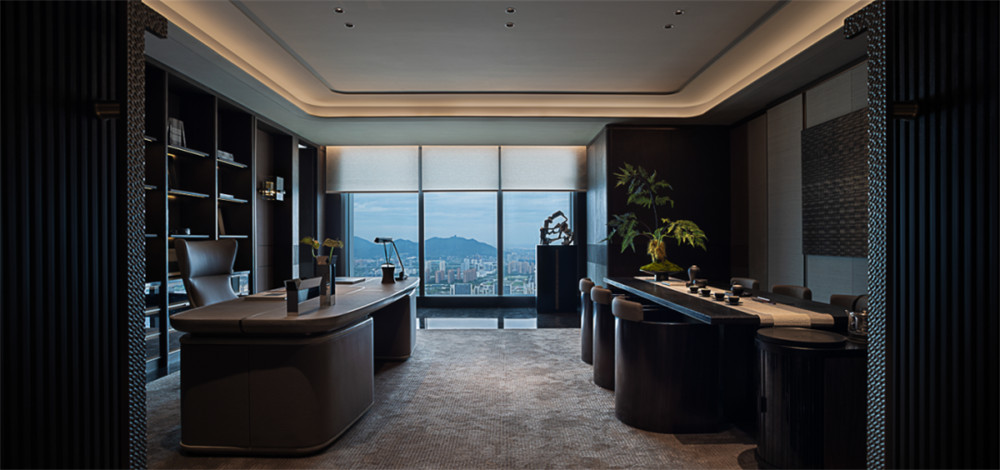 為保證私密性,總裁辦公室內(nèi)營造出一種閉合、獨(dú)立的氛圍。這是一個(gè)專屬的工作領(lǐng)域,注重實(shí)質(zhì)功能的體現(xiàn),不贅述多余的設(shè)計(jì)元素,沉靜中散發(fā)出凝固的藝術(shù)氛圍。內(nèi)部設(shè)有休息室,以酒店格局布置,提供一個(gè)更為寧靜的私密休息場所。