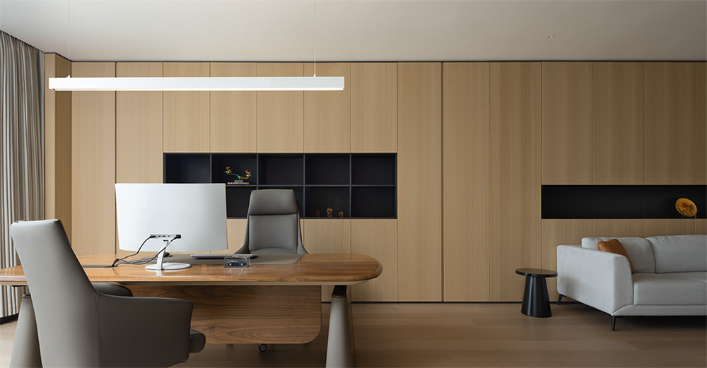 總裁辦公室置入了辦公、休閑等功能區(qū)域,連墻柜體可海量收納物件,使空間保持留白的狀態(tài),日光透過大幅落地窗灑入室內(nèi),整個空間浸潤出一片寧靜意境。