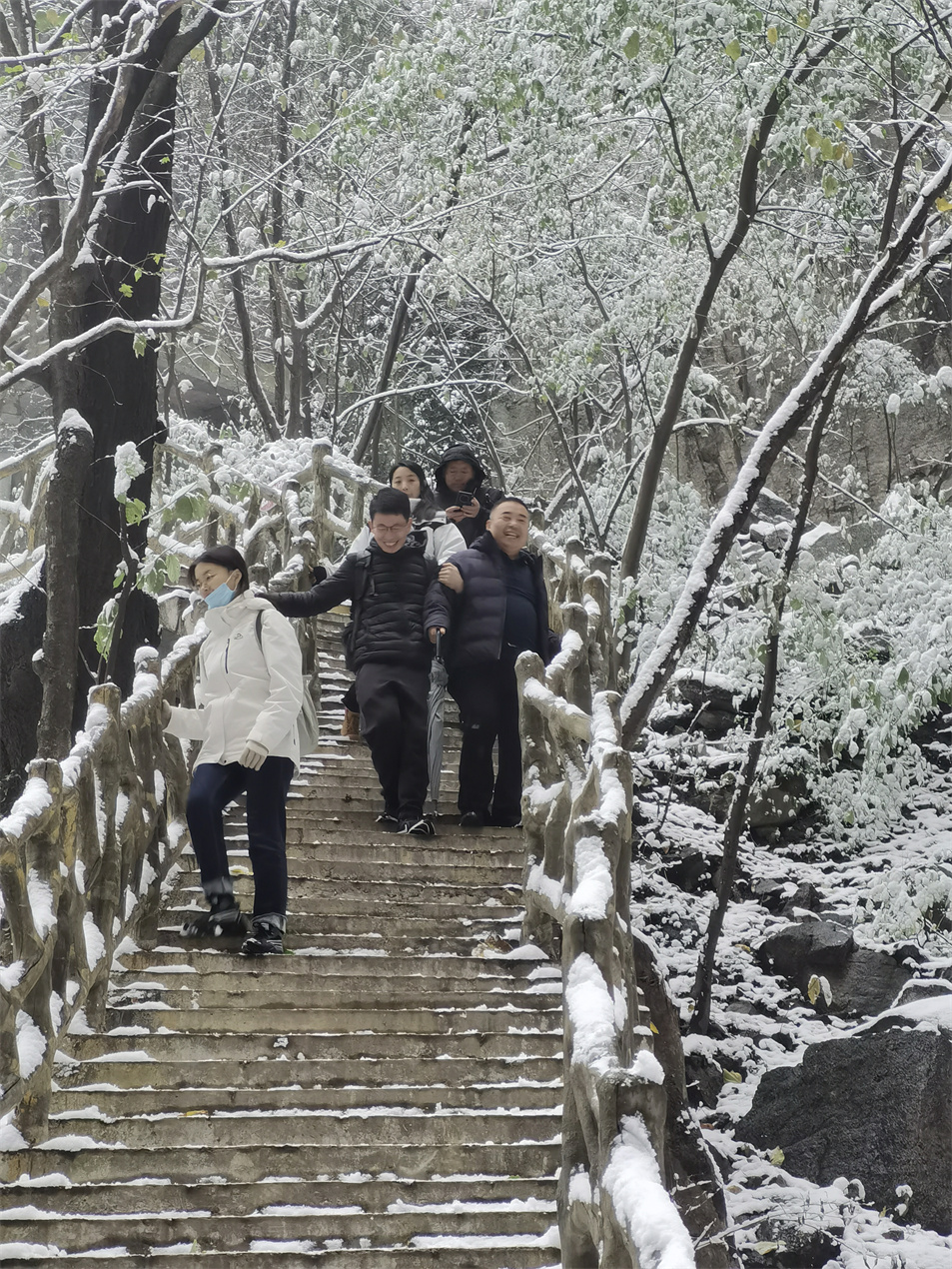 十一月十一日登玉皇頂,時(shí)逢景區(qū)入冬第一次喜降大雪,山林銀裝素裹,景象壯麗,股東們興致高昂,迎風(fēng)凜雪,成功到達(dá)玉皇金頂。