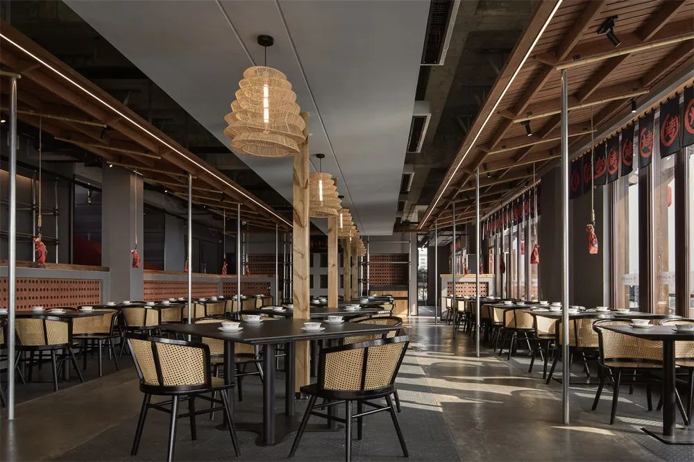 設(shè)計師從街攤帳篷的支撐結(jié)構(gòu)中找尋到靈感,將其理解為“頂”和“支撐桿”的結(jié)構(gòu)關(guān)系,運用在了比如一樓接待臺,和一些散臺區(qū)域。二樓有坡尾頂,走廊區(qū)域接地氣的裸露,大散臺區(qū)域我們利用它的層高,將川渝地區(qū)標(biāo)志性的老茶館氣氛轉(zhuǎn)化了進來,梁和柱以及坡屋頂?shù)年P(guān)系,也是作為空間中建筑性的一種表達。