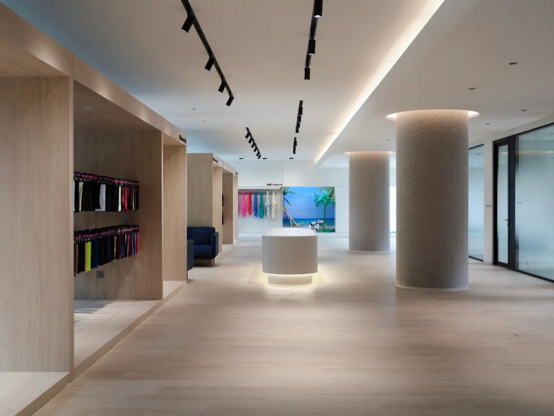 我們嘗試將布料運(yùn)用在室內(nèi)設(shè)計(jì)中,讓這種輕薄與柔性的材質(zhì)包裹堅(jiān)硬的混凝土,柔化室內(nèi)空間,同時(shí),在這個(gè)龐大的總部大樓中,也讓不同區(qū)域的布料成為一件件“展品”,參觀的客戶能夠更多元的感受面料的特性以及體會(huì)到企業(yè)創(chuàng)新的熱情。