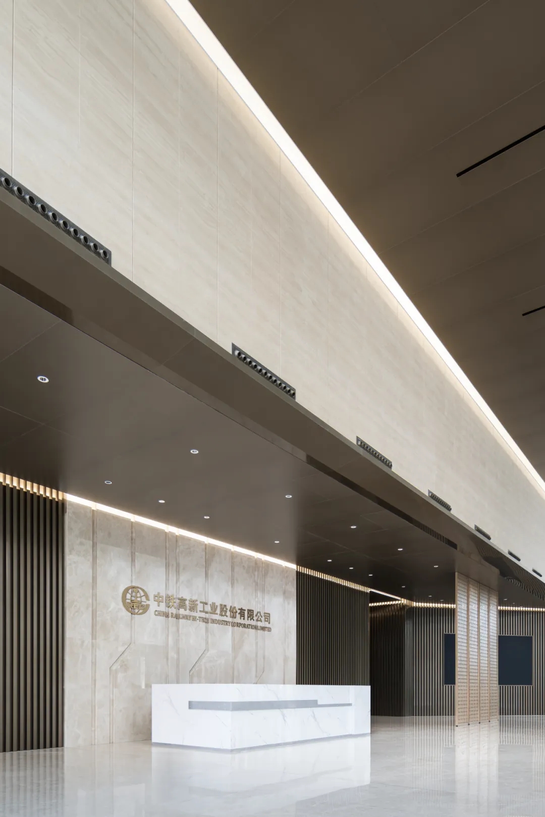 2024年初,中鐵工業(yè)新辦公大樓在北京豐臺(tái)區(qū)落成。該辦公大樓共9層,一至三層設(shè)有接待大廳、報(bào)告廳、員工餐廳、健身房、閱讀室、休息室、EAP等功能空間;四至九層則以辦公區(qū)為主,同時(shí)涵蓋數(shù)字化展示中心,數(shù)字化決策中心、貴賓室等其他區(qū)域。總體空間寬敞,布局合理,功能完備。新辦公大樓,對(duì)外是“中鐵工業(yè) 世界品牌”形象的重要展示窗口;對(duì)內(nèi),則需要給員工提供一個(gè)舒適高效,有助于提升企業(yè)認(rèn)可度的空間環(huán)境;同時(shí),它還應(yīng)秉持綠色環(huán)保,可持續(xù)化的發(fā)展理念,以體現(xiàn)央企高度的社會(huì)責(zé)任感。以此為據(jù),擔(dān)綱該新辦公大樓設(shè)計(jì)的專(zhuān)業(yè)設(shè)計(jì)團(tuán)隊(duì)決定圍繞“大國(guó)品牌”、“文化彰顯”這兩個(gè)關(guān)鍵詞,在“以人為本”、“可持續(xù)”的思路下展開(kāi)設(shè)計(jì),用現(xiàn)代簡(jiǎn)約的表現(xiàn)手法,結(jié)合中鐵工業(yè)企業(yè)特征,打造出一個(gè)沉穩(wěn)大氣中蘊(yùn)含銳意與創(chuàng)舉,深厚底蘊(yùn)下凸顯個(gè)性與活力的人文辦公空間,同時(shí)極具品牌辨識(shí)度。