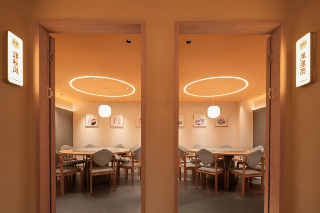 藤編主門、推拉式木隔門圍合起安靜的包間。仿牌匾形式標(biāo)語畫框“食在廣東,味在潮汕”和小幅方型科普畫懸掛于墻面,加之圓形發(fā)光燈帶、居于空間中心的圓桌,在方圓之間營造暖心的景致和濃郁的相聚儀式感。