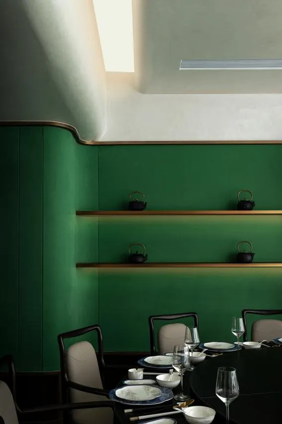 婺劇,餐飲設(shè)計(jì)師捕捉到婺劇水袖的柔美婉約,用玻璃燈管的高低排列,經(jīng)過角度的調(diào)整,把水袖的靈動(dòng)之美融入空間中,燈光流轉(zhuǎn),光線明暗變幻,氛圍感立現(xiàn)。臉譜也是婺劇的特色之一,設(shè)計(jì)師把經(jīng)典的臉譜以瓷磚的方式展現(xiàn)在墻面之上,加強(qiáng)的空間的色彩。
