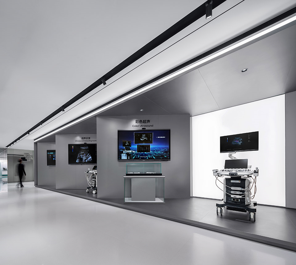 展廳融合展示了集團(tuán)所涉及的各個(gè)領(lǐng)域。設(shè)計(jì)師通過(guò)極簡(jiǎn)中性的色彩包容不同領(lǐng)域的場(chǎng)景和產(chǎn)品,并且通過(guò)品牌綠色的玻璃串聯(lián)起統(tǒng)一的視覺語(yǔ)言。每一個(gè)展示區(qū)域都通過(guò)巧妙的布局和設(shè)計(jì)元素,突出了海信在各個(gè)領(lǐng)域的技術(shù)創(chuàng)新和產(chǎn)品優(yōu)勢(shì)。
