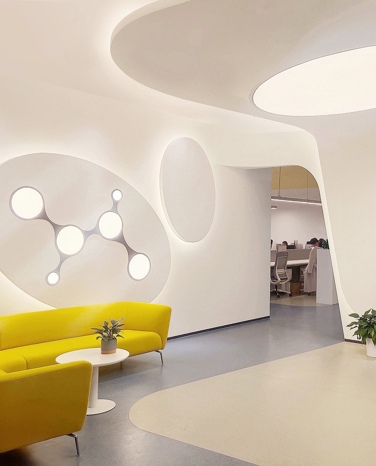 設(shè)計師將本項目風(fēng)格定位為科技風(fēng)與工業(yè)風(fēng)的混搭,力圖為客戶打造功能完備的辦公空間。整體辦公室裝修設(shè)計充分考慮與融合了客戶經(jīng)營特色及企業(yè)文化。由于客戶“腦動極光”是一家將腦科學(xué)、醫(yī)學(xué)與人工智能跨領(lǐng)域結(jié)合的前沿科技公司。因此,設(shè)計師在創(chuàng)意中從“大腦”外形中提取了抽象的圓形元素,以及從大腦溝壑形態(tài)中提取了曲線的造型元素,運用點綴于整個空間。
