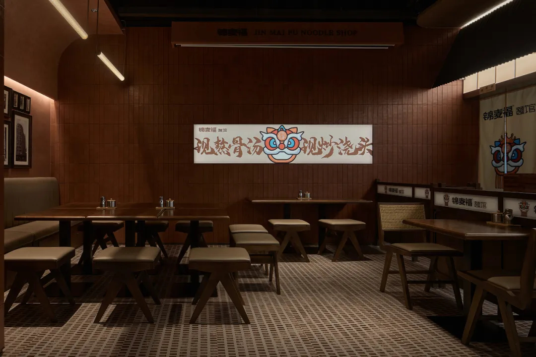 設(shè)計(jì)師也是挑剔的食客,深知每頓飯背后那份溫暖的期待。在籌備錦麥福面館首店時(shí),餐飲設(shè)計(jì)公司深入探訪了周邊的餐館,從中華傳統(tǒng)文化里精心挑選了榫卯與屋檐兩大元素,它們不僅是歷史的印記,更是文化的符號(hào)。元素進(jìn)行了創(chuàng)新性的演變與重組,融入現(xiàn)代的設(shè)計(jì)理念與材料,力求在設(shè)計(jì)中實(shí)現(xiàn)傳統(tǒng)與現(xiàn)代的和諧共生。于是,一個(gè)既帶有歲月痕跡,又不失現(xiàn)代美感的多元空間應(yīng)運(yùn)而生,它不僅僅是一家面館,更是一個(gè)讓人愿意放慢腳步、駐足享受的地方。