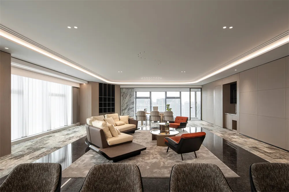 為強調(diào)該區(qū)域的主題概念同時區(qū)別于另一空間的曲型元素,融入折線這一概念,將空間大面切割,局部加入軟性柔光燈膜,硬朗與溫和,理性與感性,不同元素的對話、融合,讓空間在極簡外表下,展現(xiàn)“峽谷”般豐富的質(zhì)感和細膩層次。