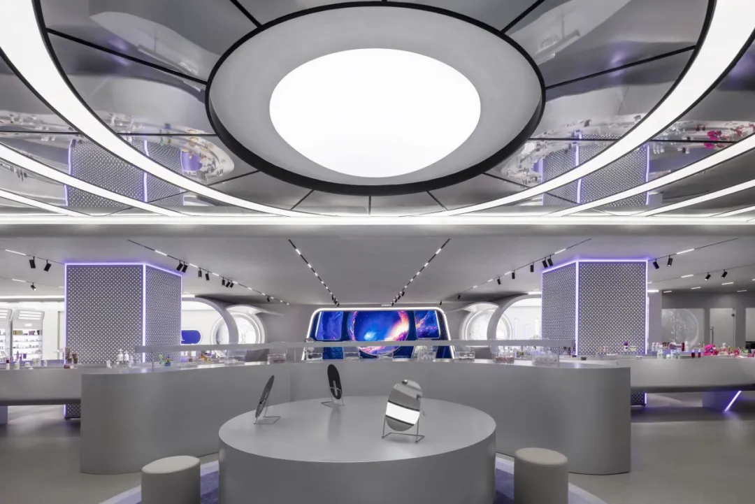 空間構(gòu)建上,化妝實驗艙的弧形設(shè)計搭配網(wǎng)格拉膜天花,模擬太空艙環(huán)境;實驗艙的觀察窗,透出的真實世界與宇宙奇觀形成對比,增加空間層次,以往商品陳列區(qū)的傳送帶元素模擬物資運輸,兼具功能與科技感。