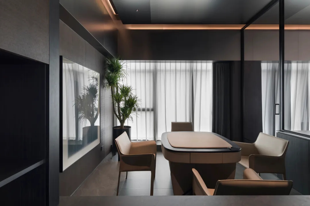 同樣作為企業(yè)的接待會(huì)所,設(shè)計(jì)師希望人們走進(jìn)空間中感受到的并非直白的、琳瑯滿目的造型,而是一種令使用者感到舒適、松弛與自如的整體氛圍。整體空間色調(diào)呈現(xiàn)為統(tǒng)一的暗色調(diào),柔和的光線點(diǎn)綴其中,營造出一種私密、溫馨的包裹感。