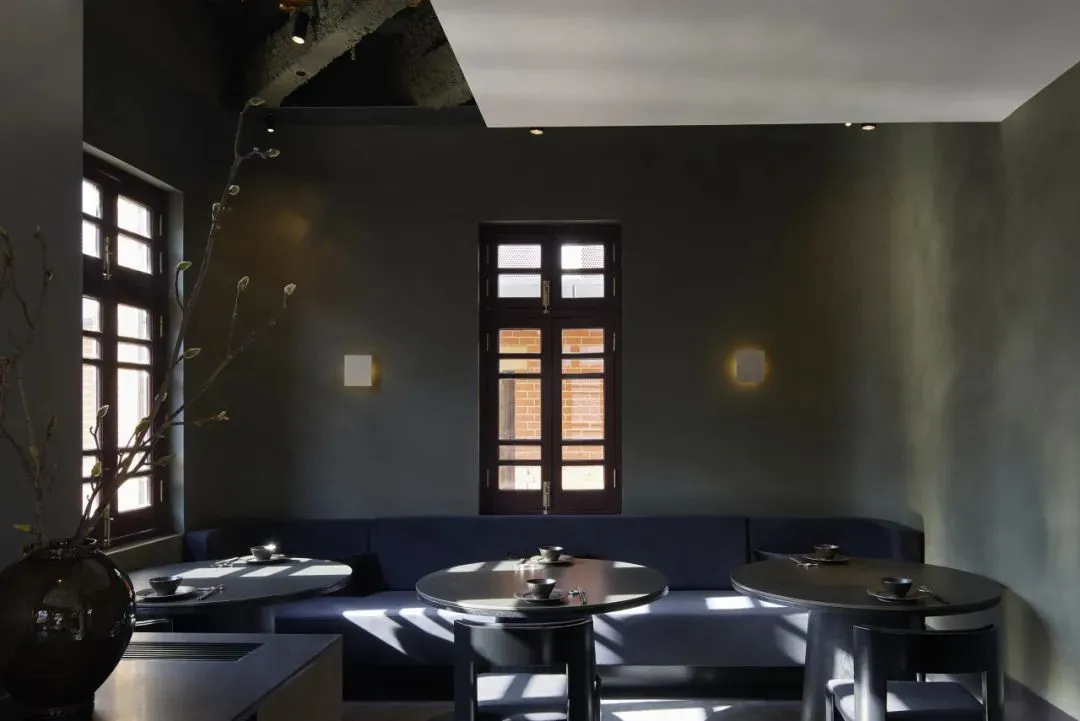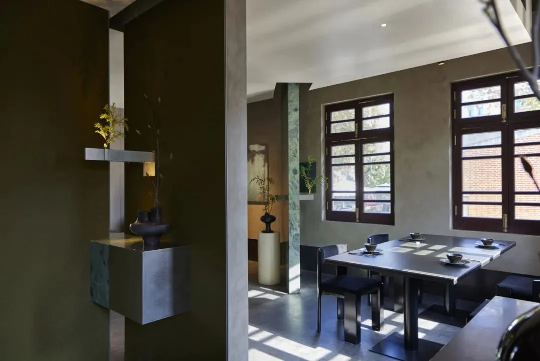 餐廳空間落在園區(qū)盡頭兩棟獨(dú)立建筑中,其中一號樓是建造于三十年代的歷史洋房,旁邊間隔一米多的二號樓則是七八十年代新加建的。為了突出雙樓屬性,用品牌名分別命名兩棟建筑,首字“蔥”為一號歷史洋房,取以“蔥影”;“蘢”為二號新樓,取以“蘢郁,雙樓共同組成這家餐飲品牌的旗艦店。
