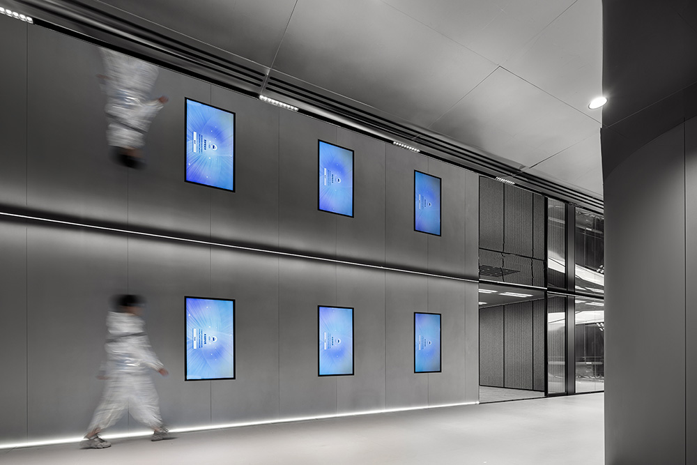 前者區(qū)穿過一條寬敞的過道,來到展區(qū)。在這里,淺灰色調(diào)用來軟化黑色的影響。燈的嵌入使展廳的輪廓更加突出。整體設(shè)計(jì)可以在視覺上達(dá)到平衡,層次和線條的組合可以統(tǒng)一展示。