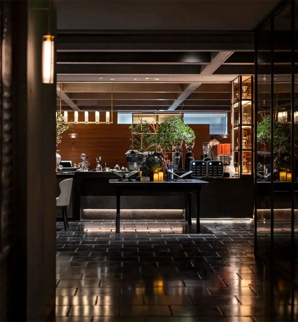 厚重夯土墻面包裹卡座,被幾處漏窗打破,攜光而入,點(diǎn)燈落桌,殷紅漆器,碗中紋飾復(fù)古,微醺慢飲,混亂了時(shí)空。暖光渲染柜中美酒,陣列式燭臺(tái)懸掛操作臺(tái)上方,視線穿透咖啡吧望見(jiàn)遠(yuǎn)處長(zhǎng)廊,隨步調(diào)轉(zhuǎn)折,飲茶空間被徐徐展開(kāi)。