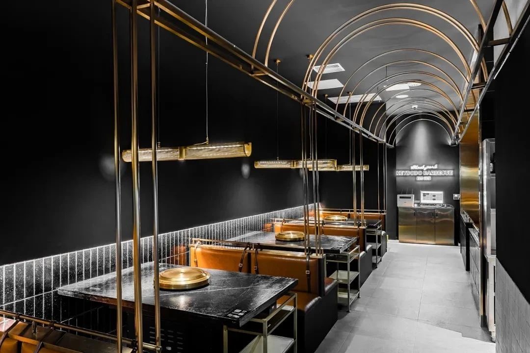 這樣個(gè)性的烤肉店可還行?用黑白金打造出獨(dú)特感!嘿嘟嘟黑豬烤肉店裝修設(shè)計(jì)以黑白金為主色調(diào)進(jìn)行設(shè)計(jì),一眼望去就是低調(diào)的奢華,大量使用木色、棕色的皮革作為空間對(duì)比色,形成視覺(jué)上的切割與延續(xù),為場(chǎng)域注入了趣味性和藝術(shù)性。
