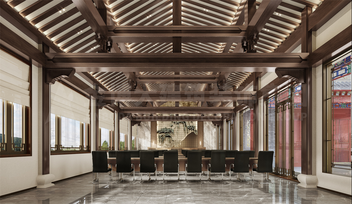 會議室與接待大廳以隱形門相連,延續(xù)古色古香的裝飾手法,頂部以祥云圖案裝飾,打造安靜、莊重的會議空間。